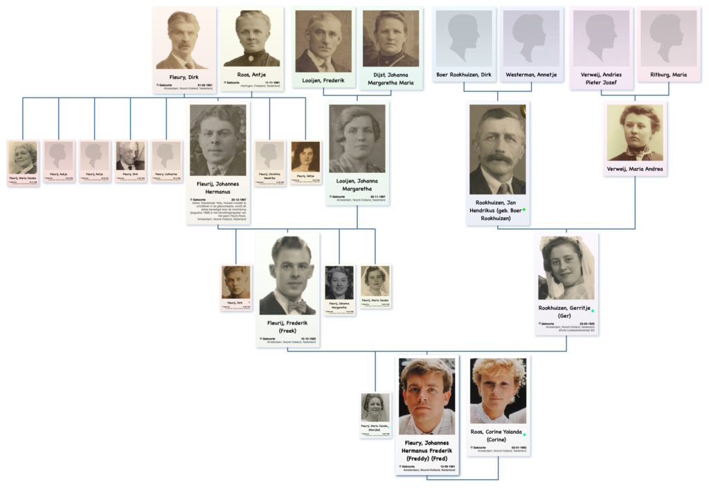 Het stamboomonderzoek (sinds 1975) en de inrichting van deze website (vanaf 1997) met de resultaten van het onderzoek is door mij (Fred Fleury) persoonlijk uitgevoerd.